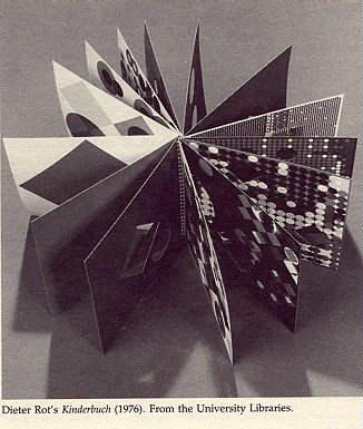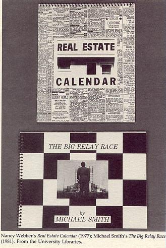 In the recent exhibition "Book as Image," which we curated with the assistance of Pamela Spitzmueller, a selection of artists' books from the holdings of Special Collections and the Art Library was displayed. It is interesting to ask how these ephemeral titles came to be part of a library's collections, rather than ending up in a museum. One explanation is that they are called "books," and libraries are supposed to collect books. A second explanation is that, in many cases, these works are not of sufficient monetary value to be prestigious additions to a museum's collection, even when they are one-of-a-kind artifacts. This was certainly the case when artists' books first started being produced. Now that the value of those early works has been recognized, and their monetary value has increased, museums seem to have considerably more interest in acquiring them. But there are definite advantages to housing artists' books in libraries, where they can be used, rather than in museums, where they can only be viewed. The chief problem in keeping artists' books in a museum is that displaying the works statically, in glass cases, undercuts the very intention of the medium. The artist's book is meant to be handled, read, seen in its entirety either in sequence or at random. To display a few pages of an artist's book is like looking at a few stills from a movie -- it cannot give a real sense, of the work as a whole. The museum setting defeats the artists' dream of a democratic art form that could be seen by anyone, freed from the walls of museums of fine art.