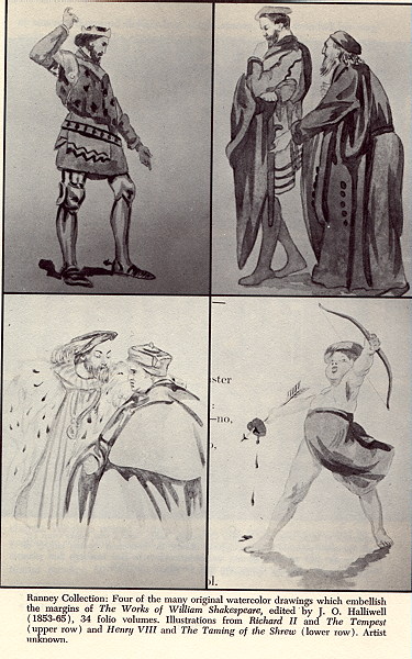 Many beautifully illustrated books are included in the Ranney Collection of which only a few can be described here. Notable among them are the volumes of the Works of William Shakespeare edited by James O. Halliwell, illustrated with wood engravings by William Fair holt, and extra illustrated with watercolor drawings in the margins. Apart from the notice of the sale of two other copies described respectively as having "water color drawings on the margins by Le Bourn" and being "extra illustrated with 700 water colors by LeBrun," no clue as to the artist who made them has been discovered. Ordinary art-reference books tell nothing about an artist by either name who worked in the period between the book's publication and its acquisition by the University Libraries.