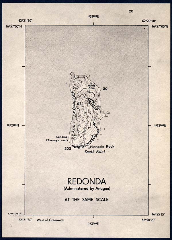 You can see Redonda on a clear day (as most are in that near-idyllic climate) from Montserrat and the more distant heights of Antigua and Nevis; but as landing is almost impossible, and the sole approach to the island's plateau extremely dangerous, the flora and fauna are little disturbed by our rapacious species. For most, the distant view is best, for Redonda is a dramatic thrust of harsh rock, rising nearly a thousand feet out of the warm blue sea, its sheer western cliffs an impregnable home for countless birds.