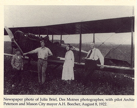 Also in the Iowa Women's Archives is a collection of materials relating to Helen Bamford (1902-1994), a studio photographer in Muscatine, which includes newspaper clippings, diaries, personal account books, albums of informal snapshots, and studio portraits -- thus far the most extensive documentation of an individual woman photographer of this type in the Archives. Having such resource material preserved is rare as are photographs of the photographers themselves. We do have a newspaper photograph taken of Julia Briel as she was about to take an airplane ride in Mason City in 1922. There is also a portrait of Lucelia Carpenter (active in Parkersburg from the mid 1880s) provided by her great niece along with the regrettable information that Lucelia's original glass plate negatives had been turned into window panes in a chicken house! Having established the relative scarcity of primary material, this article will attempt to describe some of what is known (or thought to be known) about Iowa's earlier women photographers with examples of their images from the Archives collection to illustrate the breadth of their productivity. [2]