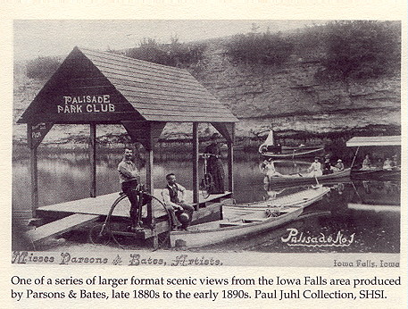 Though fewer in number, women's photographic careers were as varied in scope and quality of work as the men's. They worked in studios but some like Mrs. L.A. Schooley (mother of five and an Indianola photographer for many years from 1879) and Parsons & Bates (in Iowa Falls from 1889) also hauled their heavy equipment out into their communities and the countryside. Presumably, however, they were much less likely than men to follow the life of the solitary itinerant photographer with a "traveling photographic car" or tent. They usually acquired their training by working for established photographers -- the method recommended by Frances Benjamin Johnston, who pointed out that the few schools in existence in her day were in large cities and designed chiefly for amateurs. Lizzie Rossiter followed that route in the 1880s when she left primary school teaching and went to work for a photographer in St. Ansgar. When he moved on in a few years, she acquired the business, soon took in her sister Tillie as partner, and as "L.M. & T.E. Rossiter" they worked together in their second floor gallery over their residence for over forty years. Lizzie in turn also trained her two younger brothers and a series of young women, some of whom went on to operate their own galleries elsewhere or to work as retouchers for other photographers. Other sister-partners were the Woodwards in Burlington, the Marbles in Vinton, and the Gonwicks in Northwood. Partnerships of apparently unrelated women were Parsons & Bates (Stella and Hatta) in Iowa Falls and Tibbetts & Ernst in Cresco.