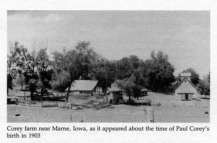 A successful writer draws upon childhood experiences and adult powers of observation. This duality explains Paul Corey as the novelist who grew up in rural Iowa in the early twentieth century, and what influenced him later to write the Mantz Trilogy, the story of an Iowa farm family. The first volume entitled Three Miles Square appeared in 1939, followed by The Road Returns in 1940, and County Seat in 1941. Three Miles Square [1910-1916], the most purely agricultural volume in the trilogy, introduced the Mantz family members and other principal characters, while providing the mise-en-scene for what happened to the rural economy prior to World War I. The Road Returns [1917-1923] followed with the Mantz family's war-time prosperity, sale of the farm, and the move into the nearby town. The concluding volume, County Seat [1924-1930] painted a grim portrait of agriculture and of rural based towns that offered no financial refuge when surrounding countryside farmers failed financially in the 1920s. [1]